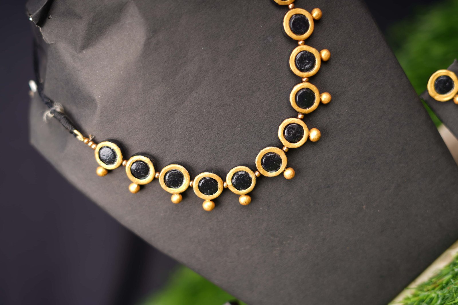 This Black & Gold Circular Terracotta Necklace Set combines traditional artistry with modern elegance. Each circular pendant is handcrafted from natural terracotta clay, painted in deep black and bordered with rich gold tones for a premium ethnic look.