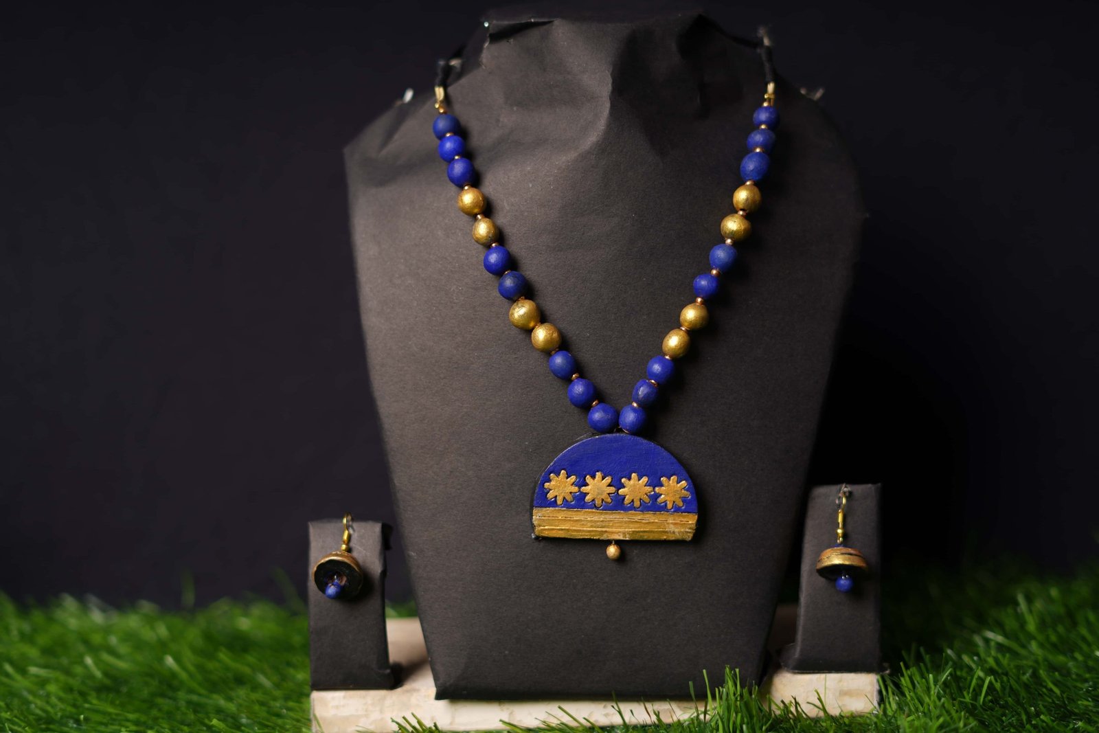This Blue & Gold Half-Moon Terracotta Necklace Set is a beautiful fusion of traditional craft and modern style. The centerpiece showcases a half-moon pendant hand-painted in a deep royal blue, decorated with delicate golden floral motifs and a gold border.