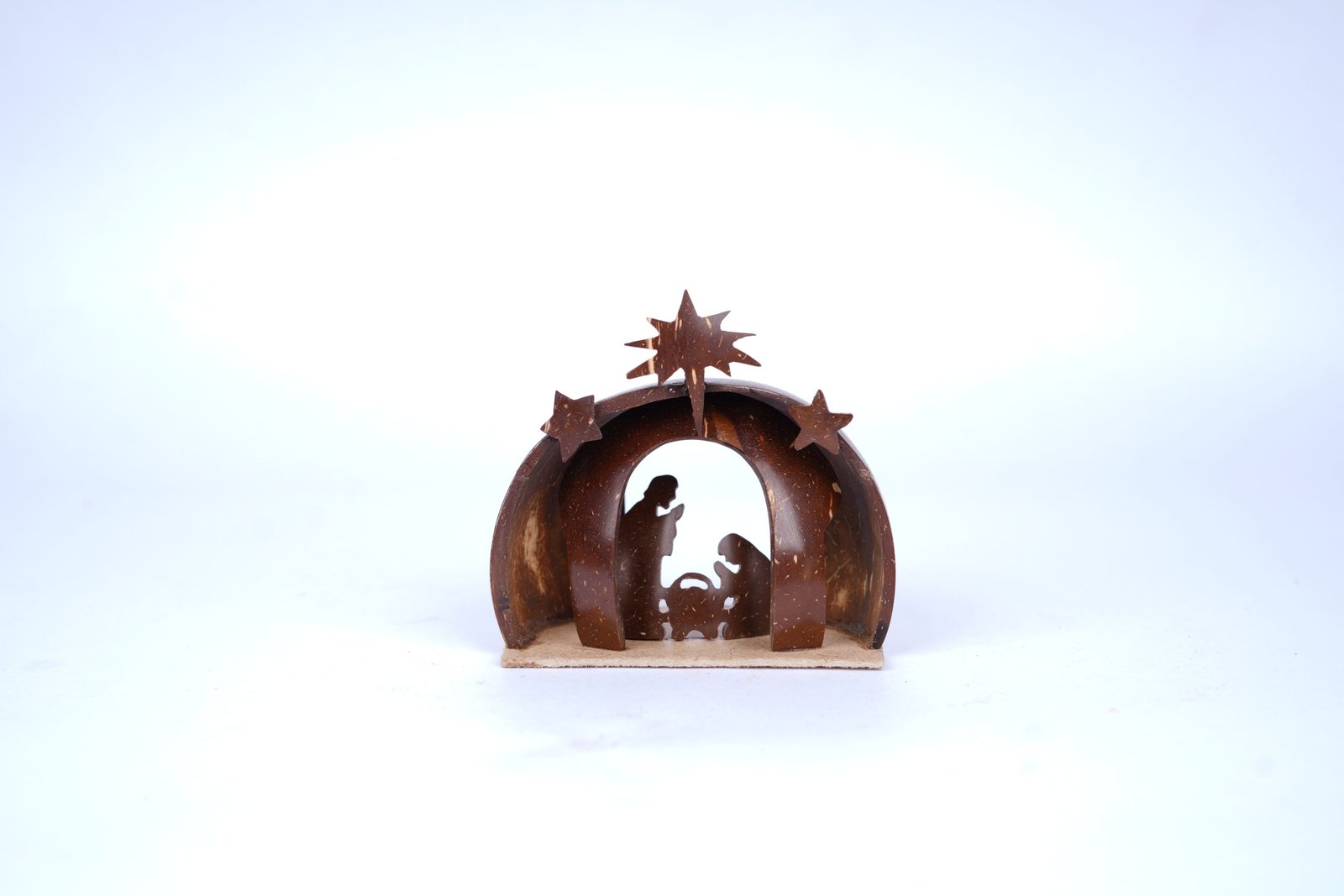 This handcrafted nativity scene captures the serene moment of Baby Jesus’ birth, featuring Joseph and Mary inside a beautifully carved coconut shell arch. Detailed stars and the Bethlehem guiding star add a divine festive charm, making it a perfect Christmas décor piece for homes, churches, offices, and gifting.
